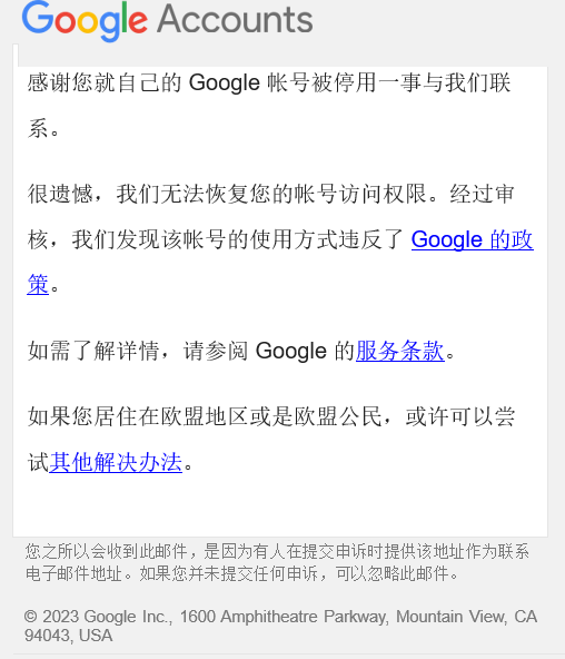 如果在发出申诉的同时秒收到这封邮件,那么你的账号是100%恢复不了了: