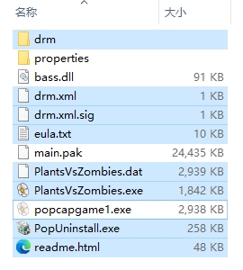 脱壳之后启动器和加密文件可以删除,再把本体重命名为PlantsVsZombies.exe,可以删除的文件(夹): drm/ drm.xml drm.xml.sig PopUninstall.exe eula.txt readme.html。